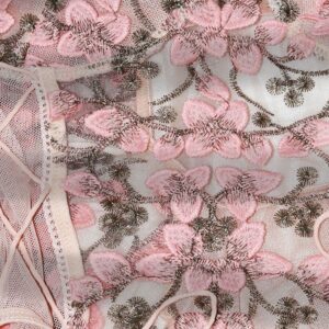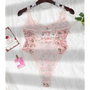 - Body de encaje bordado con flores rosadas y transparencias suaves.
