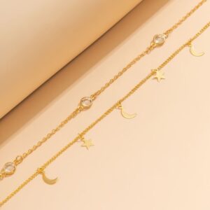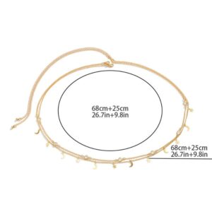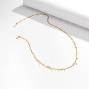 Su diseño doble abraza la cintura con una armonía delicada que realza la silueta natural del cuerpo. Las cadenas se disponen en dos niveles finos y proporcionados, creando un contorno visual que estiliza y acentúa la zona del abdomen con sutileza. La segunda capa incorpora pequeños dijes de lunas y estrellas, un detalle que añade un toque místico y femenino, perfecto para quienes aman las joyas que cuentan historias y transmiten energía.