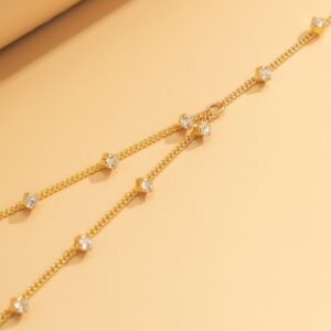 Esta joya corporal combina minimalismo y lujo en una composición que roza la perfección. Su diseño fino y sofisticado se adapta con naturalidad a la forma de la pierna, dibujando una línea de brillo que resalta la feminidad con armonía y sutileza. Las pequeñas incrustaciones distribuidas a lo largo de la cadena reflejan la luz en cada movimiento, creando destellos suaves que evocan sensualidad sin necesidad de exagerar.