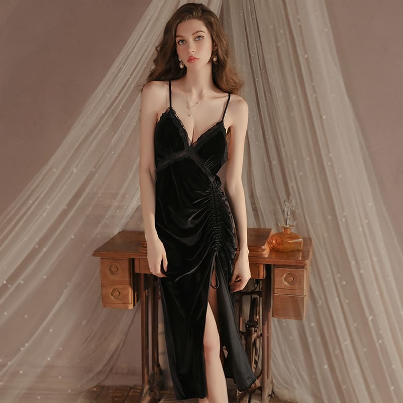 El Velvet Night es un camisón que combina la suavidad del terciopelo con un diseño pensado para resaltar cada curva. Su escote profundo en V, con delicado encaje y tirantes finos ajustables, abraza el cuerpo con elegancia y sensualidad.