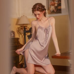 Su tela satinada acaricia la piel con suavidad, mientras que la espalda descubierta realza la silueta femenina con sutileza y glamour. Este camisón es ideal para quienes buscan comodidad sin renunciar a la sensualidad, convirtiéndose en un imprescindible para noches íntimas o momentos de auto-cuidado.