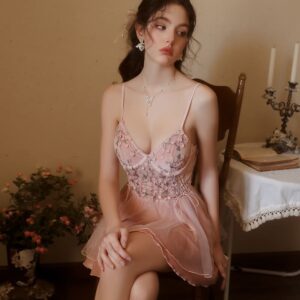 El C5240 es un conjunto que combina la suavidad del terciopelo con la ligereza del tul bordado, ideal para noches de calma y elegancia. El camisolín, con busto de encaje floral y falda de doble capa con caída fluida, resalta la silueta con sutileza y romanticismo.
