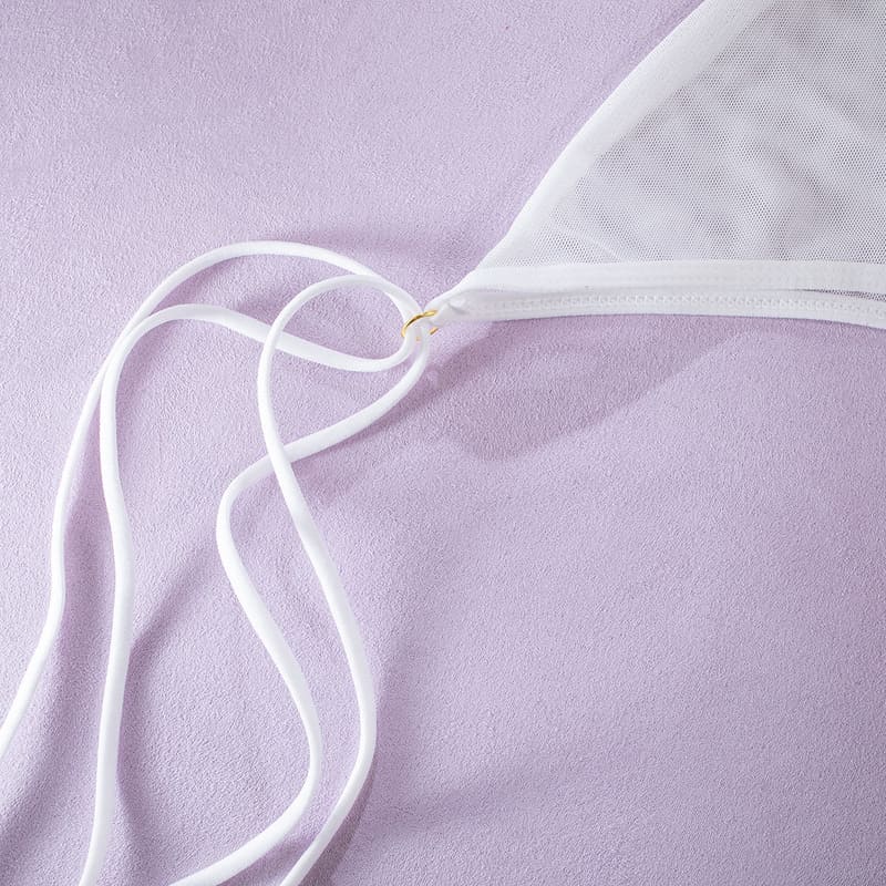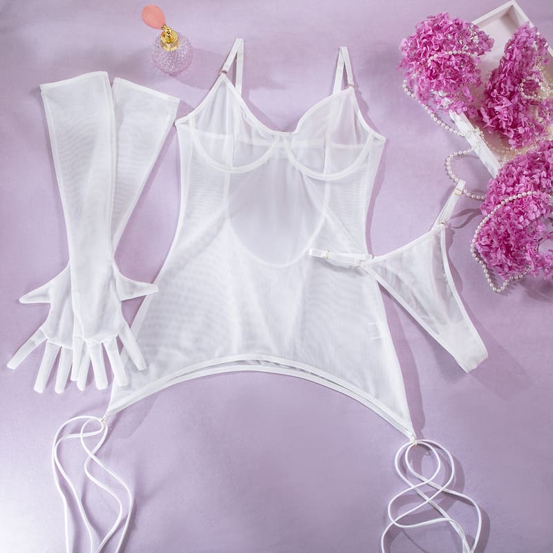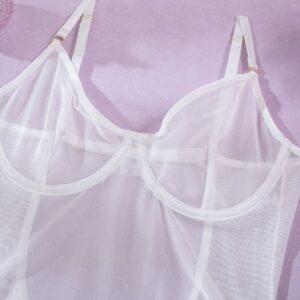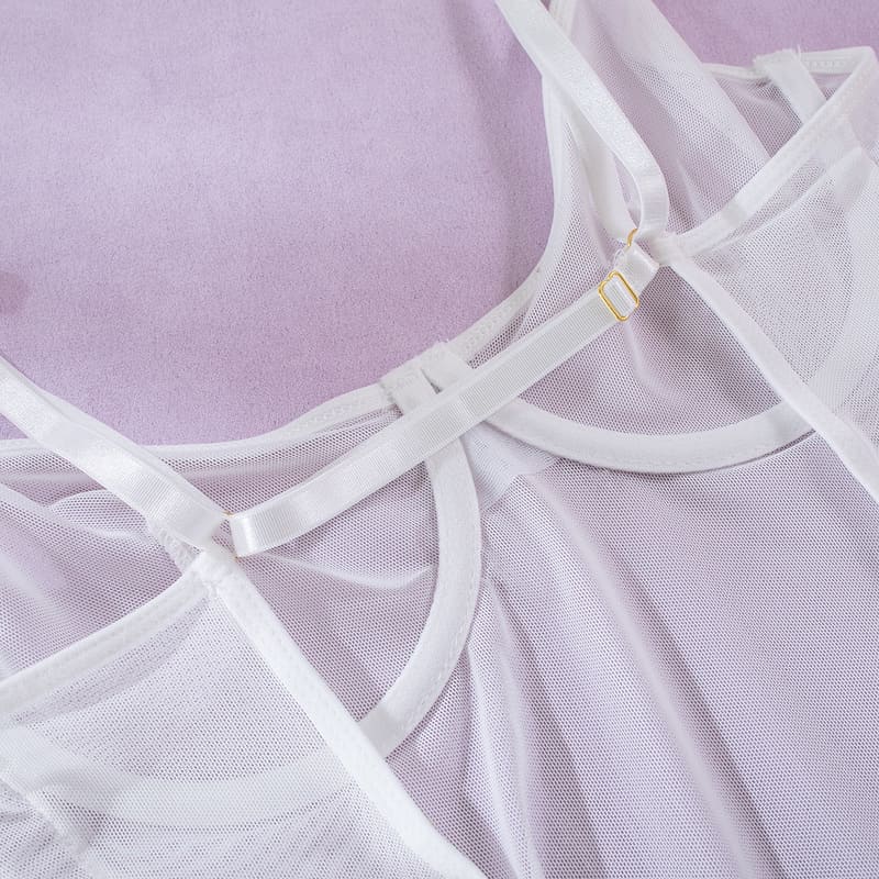 Cada detalle ha sido cuidadosamente pensado para destacar la silueta femenina con precisión y sutileza. Su tejido translúcido blanco, de malla suave y elástica, se adapta como una segunda piel, revelando lo justo y necesario para encender la imaginación. La copas con aros ofrecen una sujeción perfecta que realza el busto con naturalidad, mientras que los paneles estratégicamente delineados estilizan la figura creando un efecto óptico de cintura más definida y curvas más marcadas.