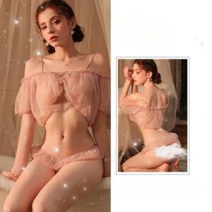 El top de gasa translúcida cae suavemente sobre los hombros, mientras el escote tipo corset con cintas ajustables en el centro permite personalizar el ajuste. La parte inferior, con encaje suave y corte coqueto, complementa el look con total armonía.